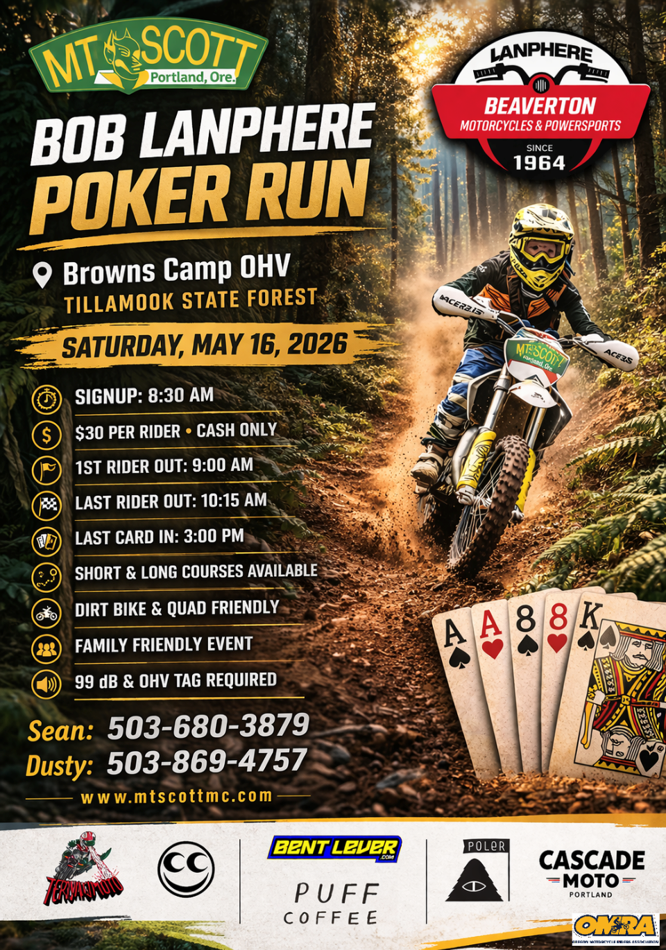 Bob Lanphere Poker Run Saturday, May 16, 2026 9:00 AM 3:00 PM 09:00 15:00 Mt. Scott Motorcycle Club TSF Browns Camp OHV area Scoggins Creek Rd, Gales Creek, OR 97117 (map) Google Calendar ICS